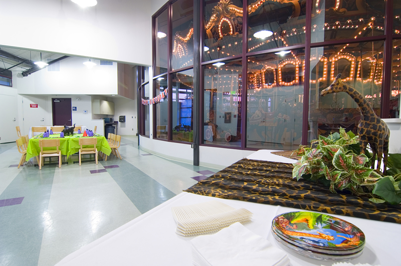 Inside our Historic Carousel building, our indoor party room offers a close-up festive view of the carousel in action. This private space is perfect for family gatherings and meetings!